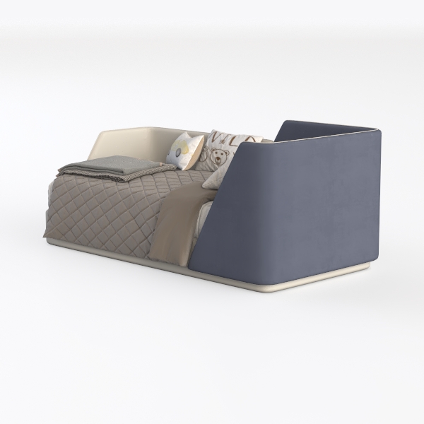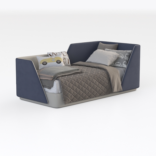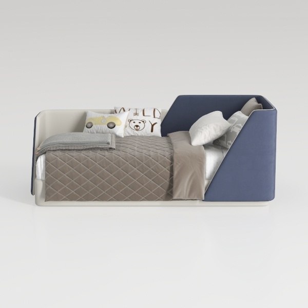 Inspired by warm childhood comfort, this bed features a soft blue headboard paired with neutral tones. Its quilted gray cover adds texture, while playful pillows with cute prints enhance coziness. Ideal for a modern kids' room, match with wooden nightstands and fairy lights. Wide, curved headboard offers great back support, ensuring a relaxing sleep.