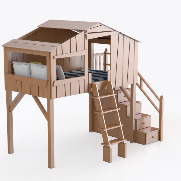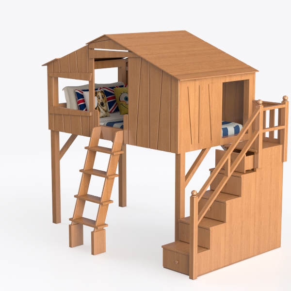 Inspired by tree houses, this wooden bed blends natural charm with playful design. Warm, textured wood and soft, earthy tones create a cozy, sunlit vibe. Perfect for a kids' room in a Scandinavian or nature-inspired style, pair it with green plants and fuzzy rugs. A ladder and staircase lead to a cozy upper bed, while built-in drawers offer handy storage, balancing fun and functionality.