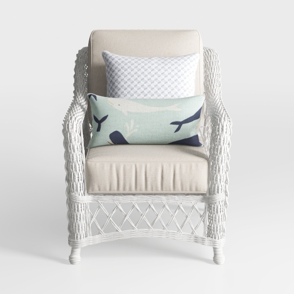 This elegant armchair draws inspiration from coastal serenity, blending the warmth of natural materials with a lighthearted, oceanic vibe. Its frame, crafted from smooth, lightweight white wicker, features intricate interwoven patterns that evoke the delicate curves of seaweed or wave crests, while the soft, neutral beige upholstery adds a calm, grounding touch. The textured wicker feels cool and inviting to the touch, its subtle weave catching light gently to create a play of shadows that enhances its airy, open feel. The two complementary cushions—one with a crisp gray-and-white check pattern, the other a soft blue with playful whale motifs—infuse the space with a cheerful, relaxed energy, balancing the chair’s minimalist structure with a touch of whimsy.