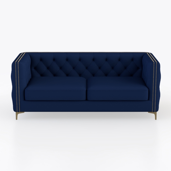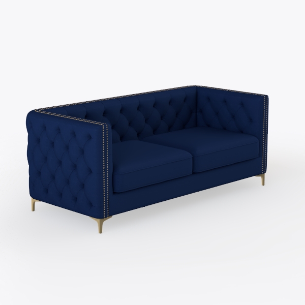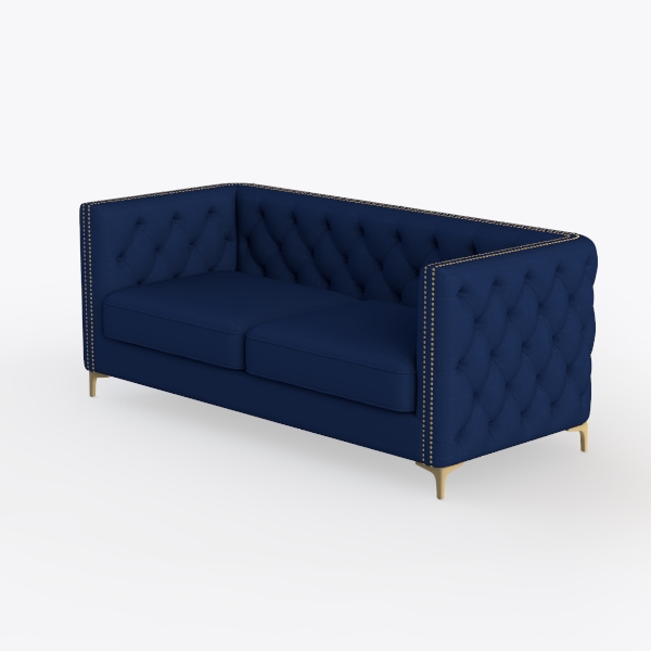 Drawing inspiration from the timeless allure of 19th-century Chesterfield sofas, this piece reimagines classic elegance with a contemporary edge. The deep navy upholstery, crafted from a luxuriously soft velvet fabric, feels sumptuously smooth to the touch—its rich, velvety texture invites lingering, while the muted tone adds warmth without overwhelming.