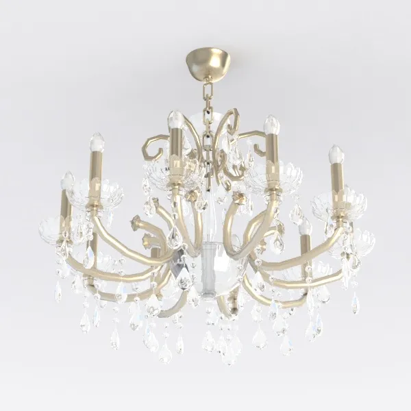 A 3D model of a chandelier, featuring golden metal frame and crystal pendants, classic aesthetic. It has detailed 3D structure with precise textures, suitable for living/dining rooms.