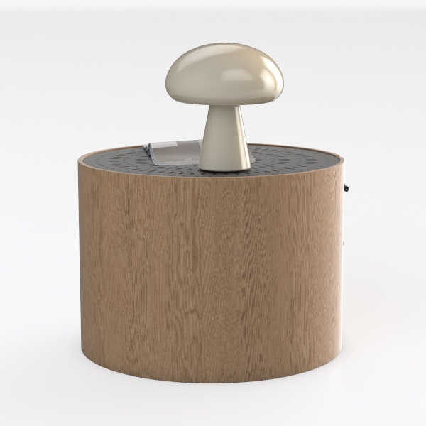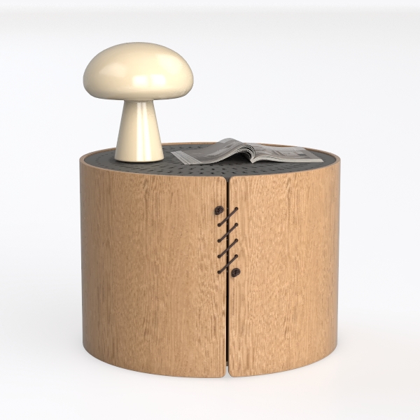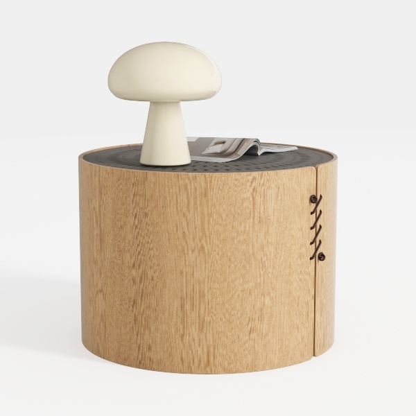 Inspired by organic forms, this round side table blends warm oak texture with a smooth black top. A soft mushroom-shaped lamp and an open magazine add a cozy, minimalist feel, while a stitched drawer offers practical storage—ideal for a modern Scandinavian or contemporary bedroom.