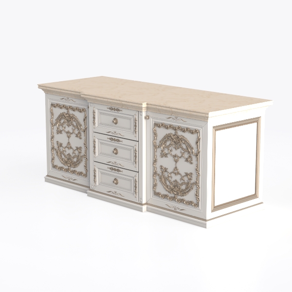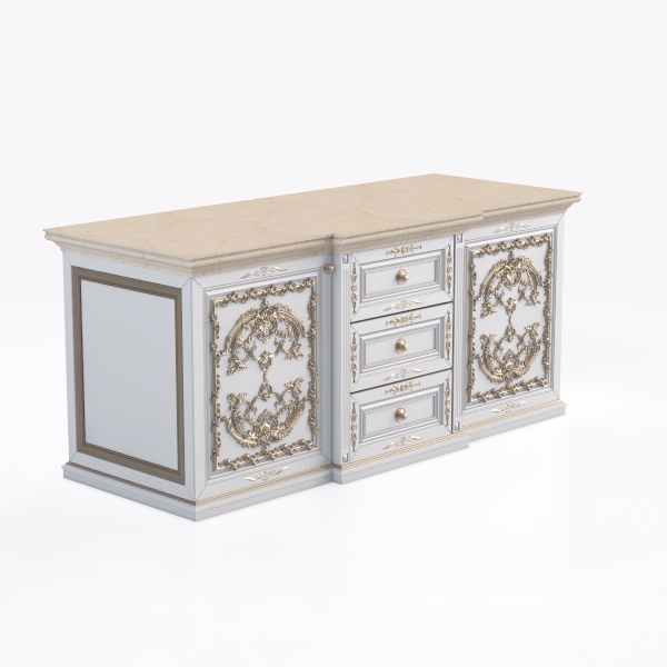 Inspired by timeless classical European design, this cabinet features delicate white wood, intricate gold carvings, and a smooth marble top, blending elegance with tactile richness. Ideal for a vintage luxury living room, it pairs beautifully with velvet sofas and crystal chandeliers, while three drawers and cabinet doors offer ample storage.
