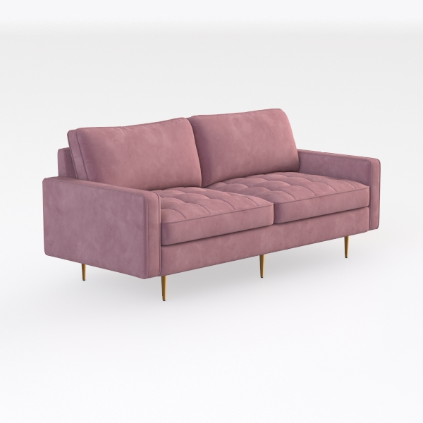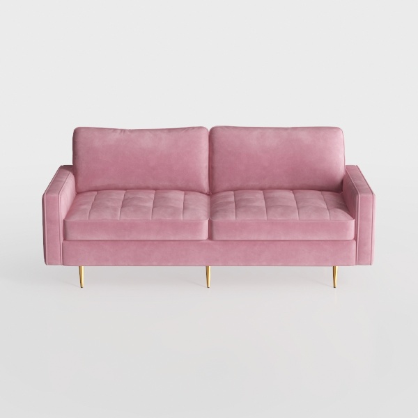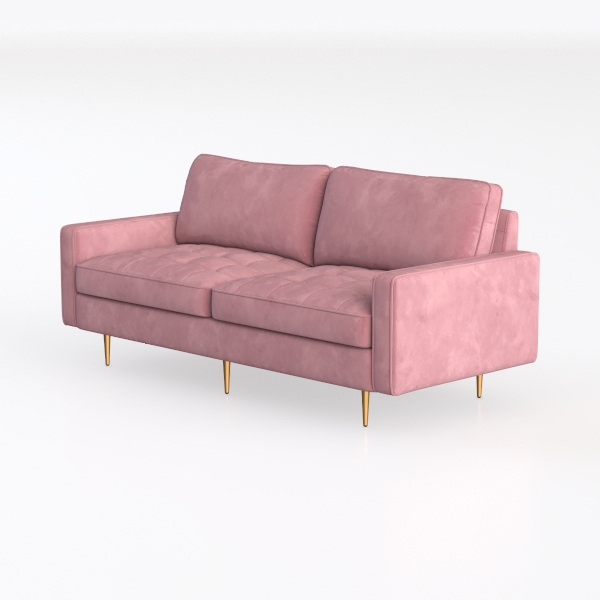 This sofa takes cues from the soft, muted allure of dawn light filtering through rose petals, blending a sense of calm with modern sophistication. Its upholstery, a delicate blush pink, feels luxuriously plush to the touch—like sinking into a cloud—while subtle tufting along the back and seat adds textural depth, elevating its refined charm. The sleek, gold-plated legs provide a striking contrast, keeping the design light and airy, so it feels both substantial and elegant.