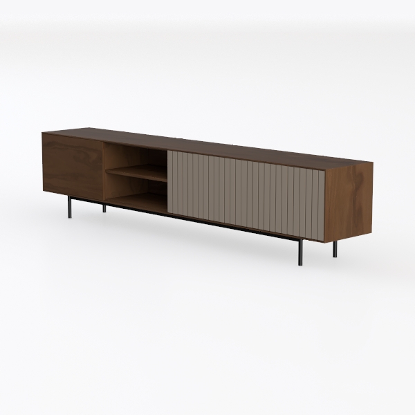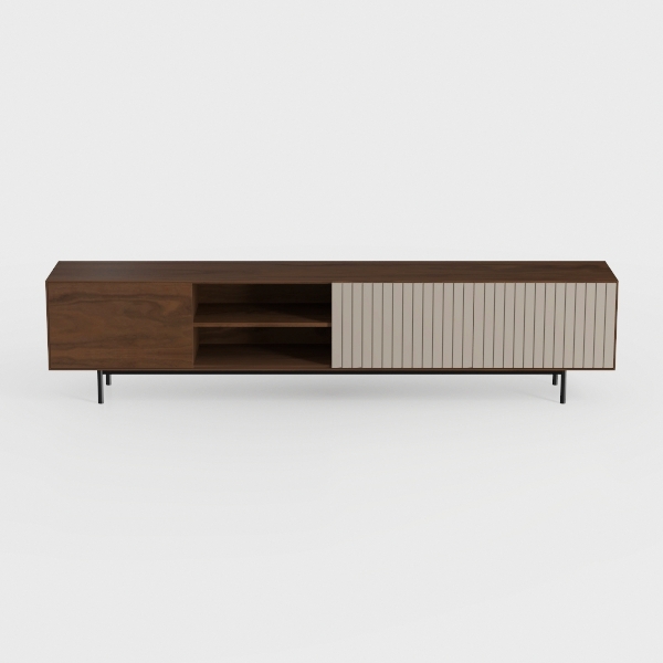 Inspired by the harmony of organic warmth and structured minimalism, this piece merges rich, smooth walnut wood on the left with sleek, subtly textured vertical slats on the right. Its black metal legs add lightness, while open shelves below and closed storage on the left offer versatile media and clutter management. Perfect for a modern living room, pairing beautifully with marble accents and matte black lighting.