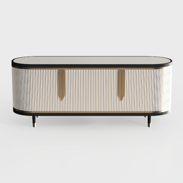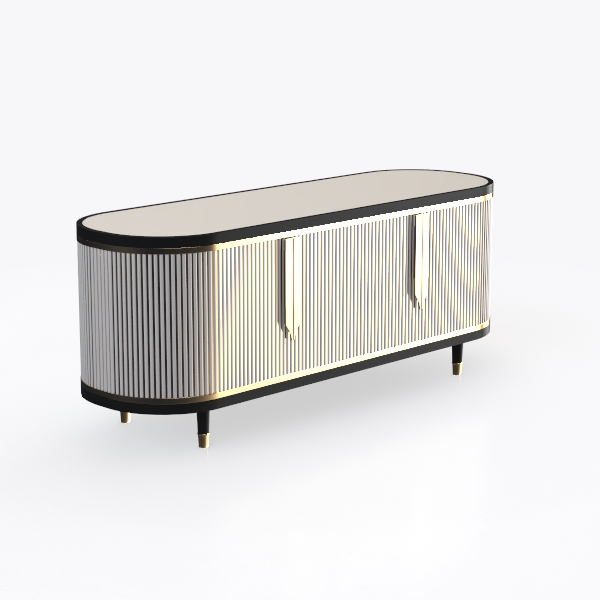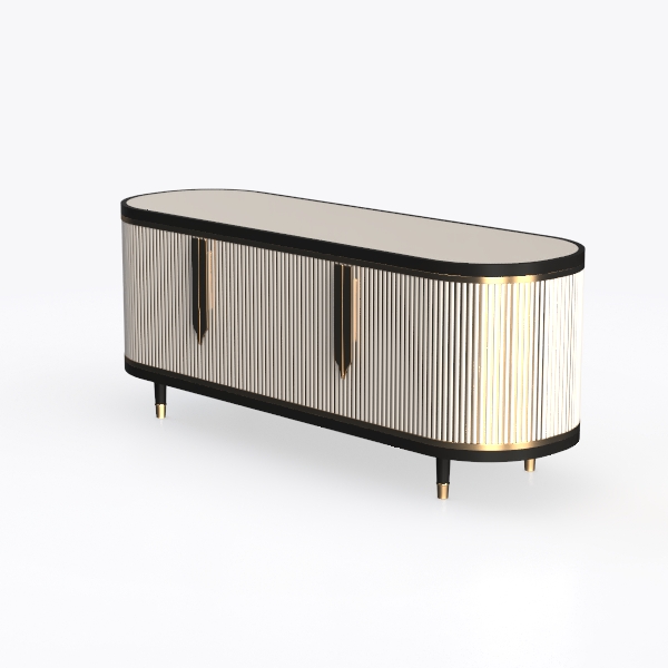 Inspired by Art Deco, this piece blends geometric precision with elegant details. Textured vertical stripes create a tactile rhythm; polished gold handles and a sleek black border add luxury, balancing strikingness and warmth. Ideal for modern-luxury living rooms, it pairs with marble coffee tables and metallic lamps, elevating space’s sophistication. Spacious storage with smooth-closing doors ensures functionality, keeping areas clutter-free.