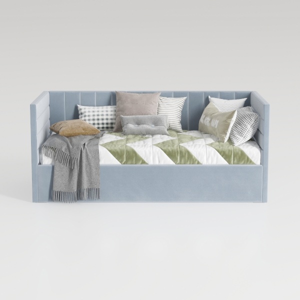Inspired by Scandinavian minimalism, this piece blends soft textures with clean lines. A muted blue, velvety upholstery creates warmth, while layered cushions (geometric patterns, fringed throws) add visual interest. Ideal for a modern living room, pairing with wooden accents and greenery, its spacious seat depth ensures cozy lounging, balancing style and functionality seamlessly.