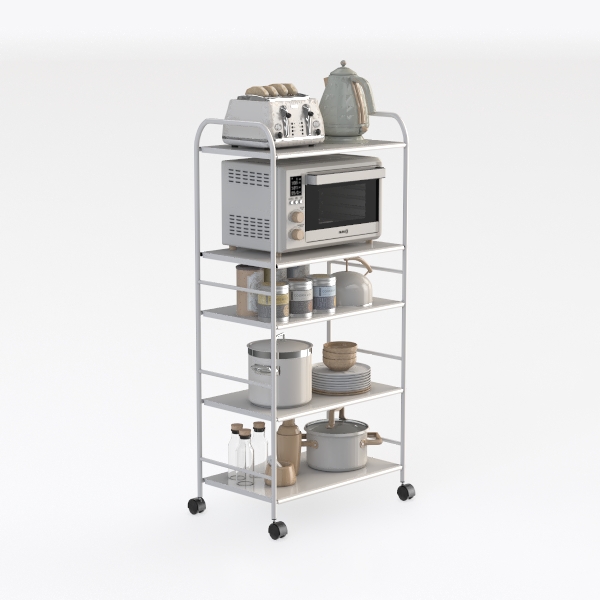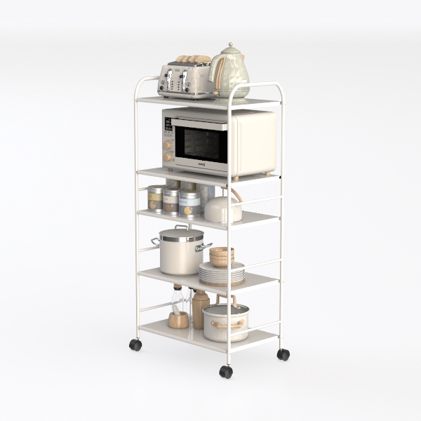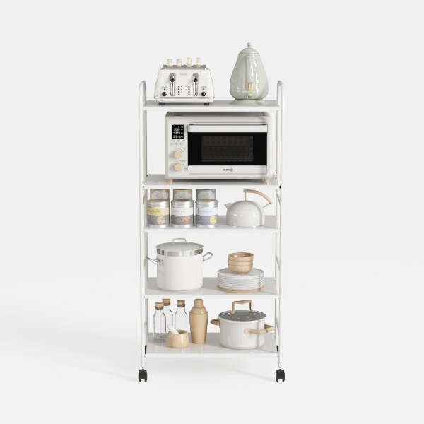 Designed to blend functionality and minimalism, this kitchen shelf takes inspiration from streamlined home organization. Its white metal frame has a smooth, matte finish, with warm wood accents adding softness, creating a clean, cozy vibe. Perfect for modern or Scandinavian kitchens, it pairs beautifully with neutral tones and natural materials. Rolling wheels and tiered shelves of varying heights offer ample storage for toasters, microwaves, jars, and cookware, keeping your space tidy and accessible.