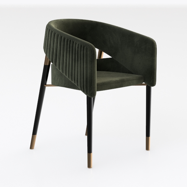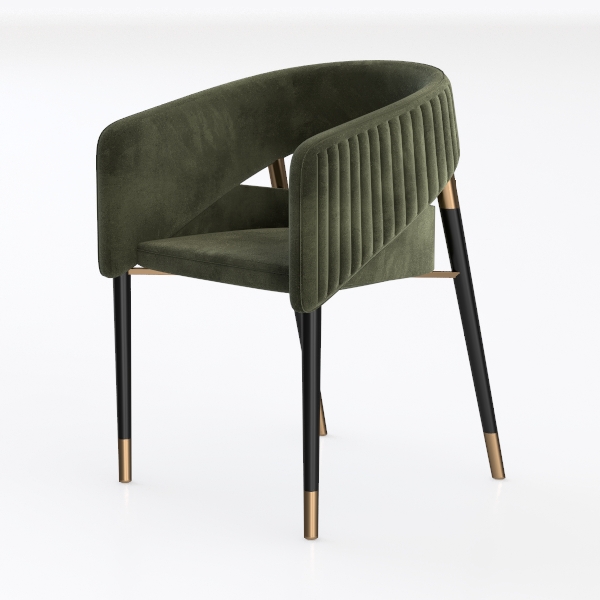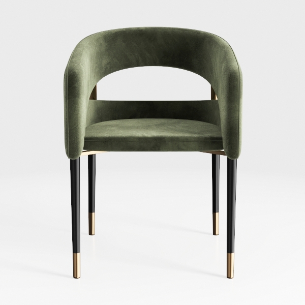 Echoes of mid-century modern design, this chair features soft velvet upholstery offering a plush, tactile experience. Sleek black legs with gold-tipped accents add elegant balance to the warm green hue, enhancing its sophisticated look. Ideal for contemporary dining or living spaces, it pairs beautifully with marble tables and metallic light fixtures, while the curved backrest ensures excellent support for extended comfort.