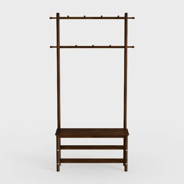Beyond its aesthetic appeal, the design prioritizes practicality: two upper rods offer ample space for coats, scarves, or hats, while the sturdy lower bench provides a convenient spot to sit and slip on/off shoes. The open lower shelf adds extra storage for baskets or footwear, keeping the area clutter-free. With its blend of warmth, simplicity, and multi-functional design, this piece balances utility and beauty, elevating any small space with both form and function.