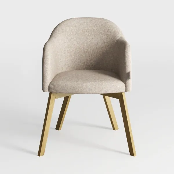 This chair draws inspiration from the harmony of organic curves and minimalist Scandinavian aesthetics, blending softness with structured elegance. Its seat and backrest feature a light, oatmeal-hued upholstery with a subtle, woven texture, inviting gentle contact and offering a warm, tactile experience. The fabric appears soft yet durable, catching light softly to create a muted, sophisticated glow that complements its understated form. Below, the legs are crafted from warm, light wood, their slim, angled profile balancing stability with a sense of airiness, while the natural grain of the wood adds a touch of organic warmth to the overall design.