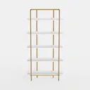 Inspired by minimalist geometry and natural materials, this elegant shelf features a gold frame with sleek, polished metal texture. White shelves, with smooth, veined marble-like surfaces, create a light yet sophisticated look. Ideal for modern-luxe living rooms or studies, pairing beautifully with potted plants, art prints, and metallic accents. Five-tiered design offers ample display and storage space, with a balanced structure ensuring stability.