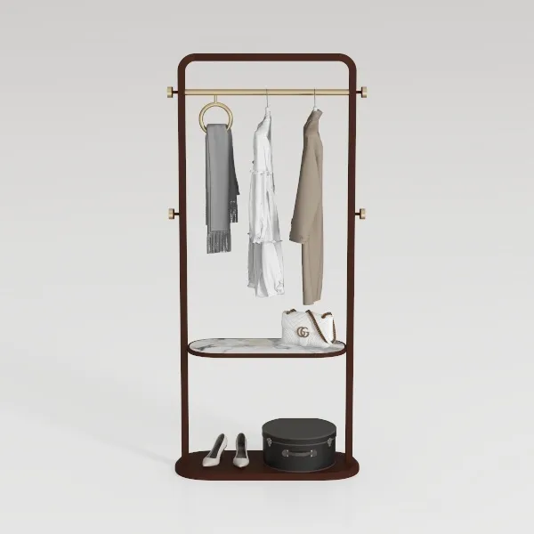 Inspired by minimalist elegance, this piece blends warm wooden textures with sleek metallic accents, creating softness and sophistication. The wooden frame has smooth, polished surfaces, while the marble shelf adds cool refinement, and the metal rod glimmers gently, enhancing modern allure. Ideal for contemporary bedrooms or walk-in closets, pairing with neutral decor. Spacious to hang clothes, store bags, and display shoes—practical and aesthetic, elevating spaces with understated luxury.