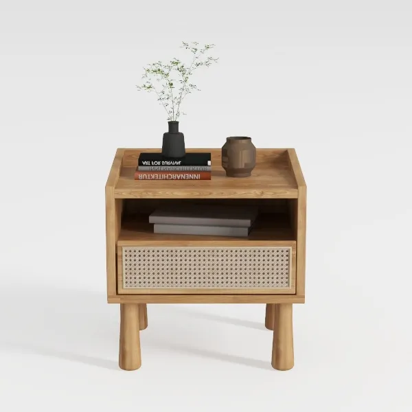 Inspired by organic textures, this wooden side table features a warm oak finish and a tactile rattan drawer. Its light, airy aesthetic blends seamlessly with minimalist or Scandi decor, ideal for a serene bedroom. Spacious storage drawer and sturdy legs offer practicality, complemented by potted plants and vintage books on top.