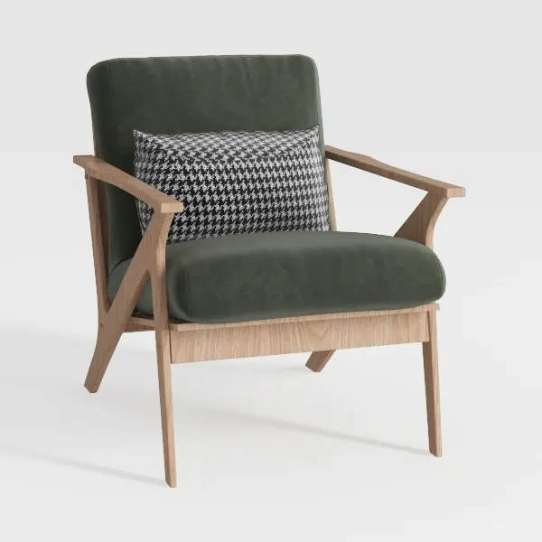Inspired by the timeless allure of mid-century design reimagined for modern living, this armchair marries clean lines with organic warmth. The frame, crafted from smooth oak, features angular yet soft-edged legs and armrests, their natural wood grain visible to highlight the material’s authenticity. Upholstered in a rich, deep olive-green velvet, the seat and back exude a tactile luxury—velvety to the touch, it invites relaxation while the muted hue grounds the piece, creating a calm, sophisticated atmosphere.