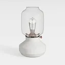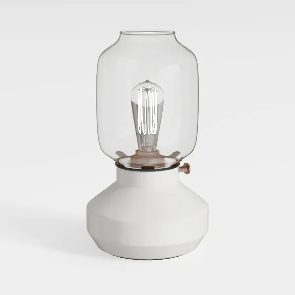 A 3D model of a Table Lamp, featuring a transparent glass shade, white base, and Edison-style bulb with metal accents, and a modern minimalist aesthetic. It has low polygon count and high detail, suitable for home decor and interior lighting design.