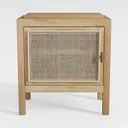 Inspired by organic textures, this wooden side table features a warm oak finish and a tactile rattan drawer. Its light, airy aesthetic blends seamlessly with minimalist or Scandi decor, ideal for a serene bedroom. Spacious storage drawer and sturdy legs offer practicality, complemented by potted plants and vintage books on top.