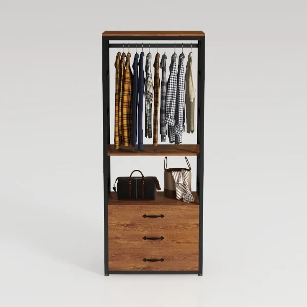 Designed to blend warm wood and sleek metal, this storage piece draws inspiration from minimalist organization. Its textured wooden surfaces and smooth metal rods create a balanced, modern vibe—cozy yet structured. Ideal for a contemporary bedroom or walk-in closet, pairing well with neutral decor and soft lighting. Spacious hanging rods hold shirts and coats, while three drawers and a lower shelf offer ample space for bags and small items, merging style and functionality seamlessly.